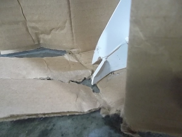 アーチ窓が入荷した際に検品すると、窓の入っていた箱が少しだけ小さかったためフィンが箱から飛び出し、半分に割れてしまっていました。