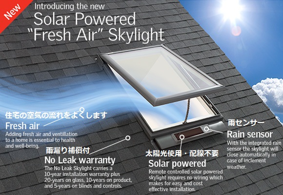 天窓で有名な Velux より新商品、ソーラーパワー・フレッシュエアー・スカイライト